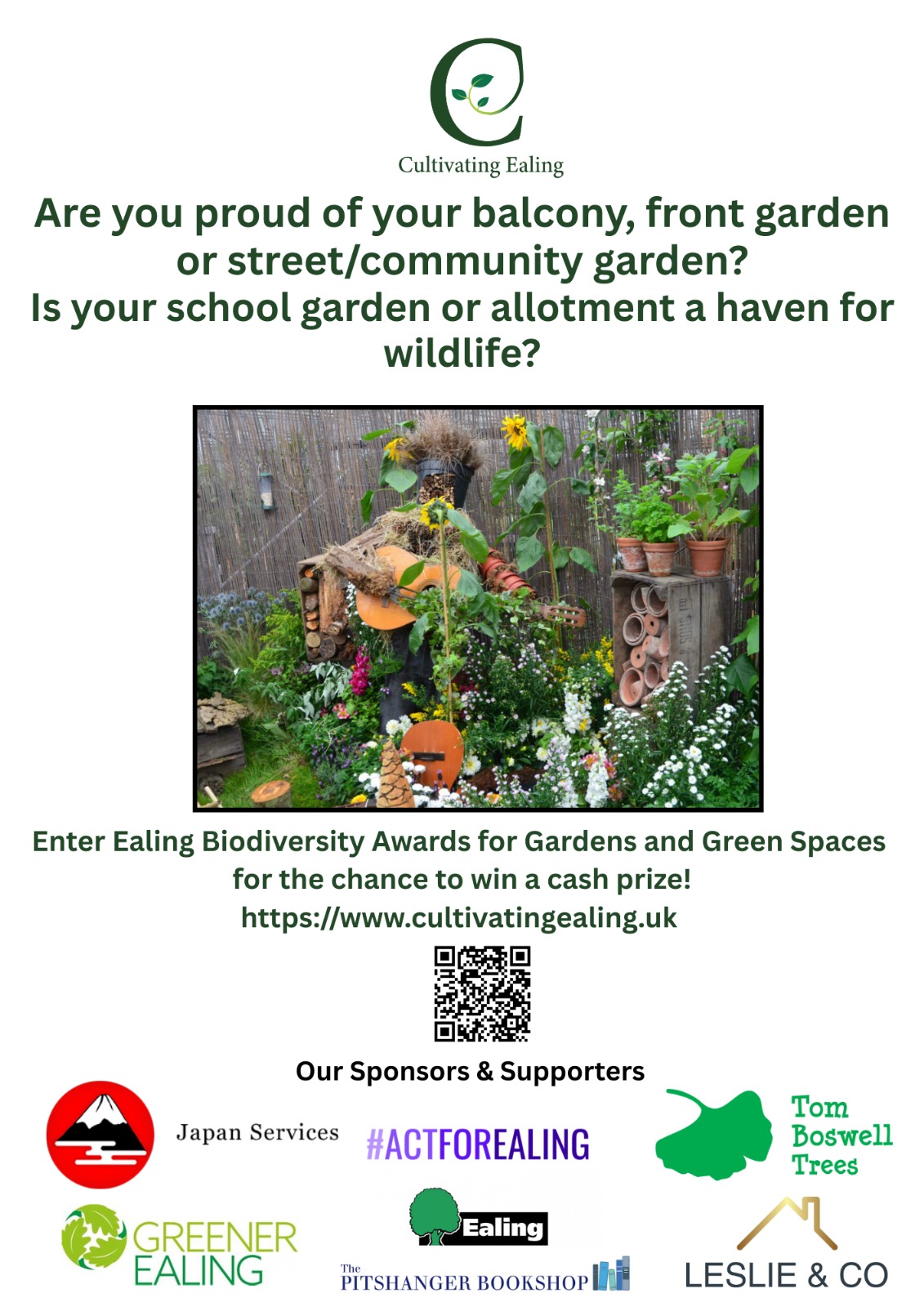 The deadlines for entering your garden or green space into 2025’s Ealing Biodiversity Award is fast approaching. Do you have a front garden you’re proud of? Are you rethinking your front door step? Do you want your balcony to support biodiversity? Do you love nature, birds and mini beasts? Then the Ealing Biodiversity Awards for gardens is for you! More information is available on the ActForEaling website here, and Cultivating Ealing website here.